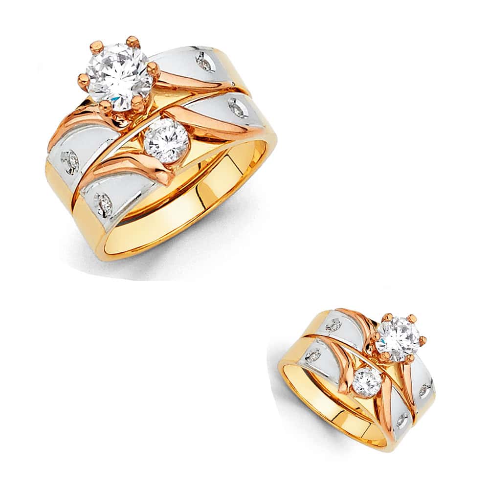 14K Tri Color Gold Cubic Zirconia Engagement Ring and Ladies Wedding Band Set