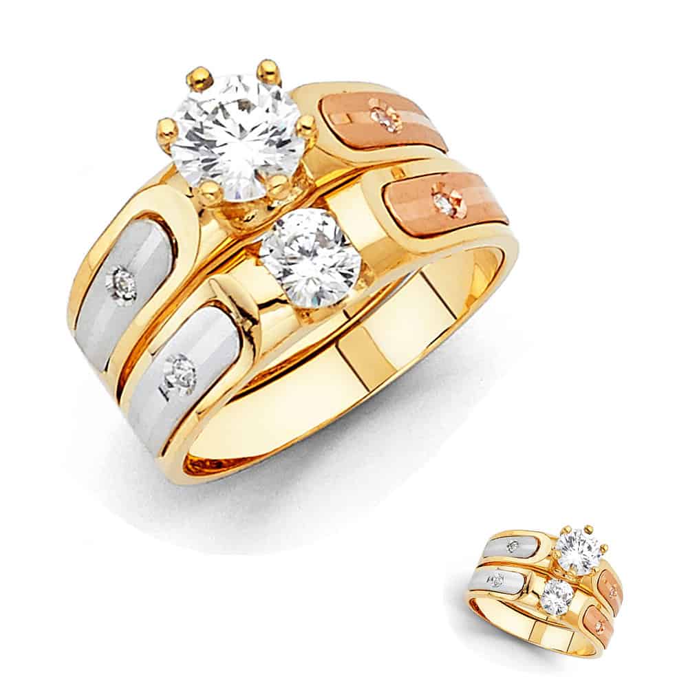 14K Tri Color Gold Cubic Zirconia Engagement Ring and Ladies Wedding Band Set