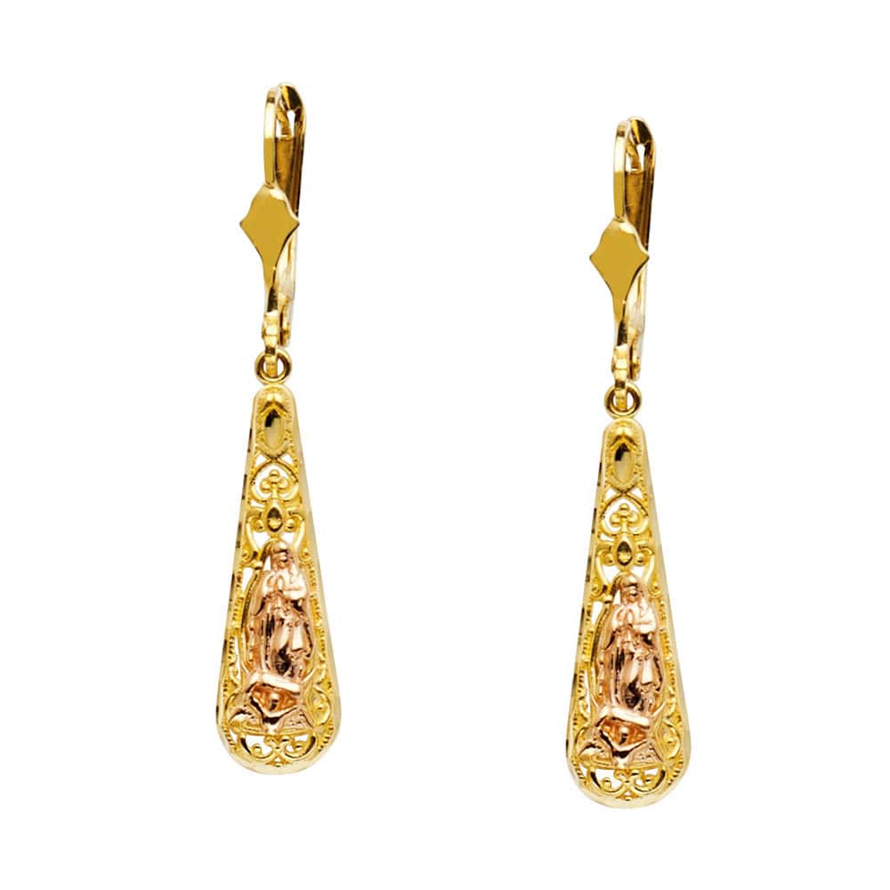 14K Two Tone Gold Our Lady of Guadlupe Teardrop Hanging Earrings