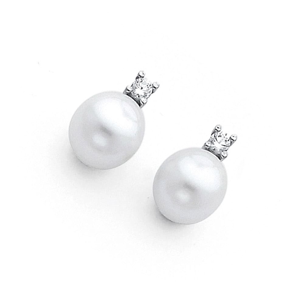 14K White Gold 8mm Pearl with Cubic Zirconia Earrings